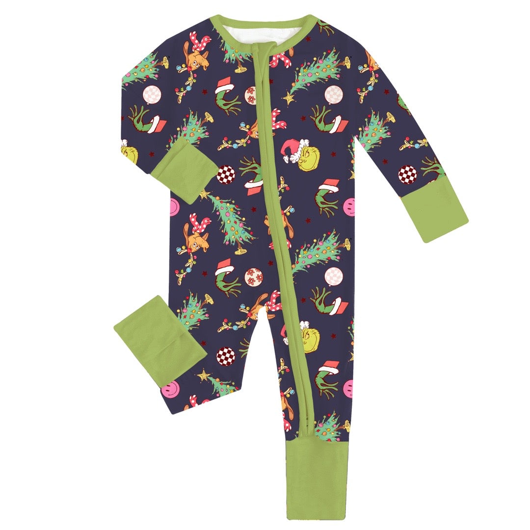 Christmas Green Guy Deer Print Bamboo Zippy Pajamas Romper
