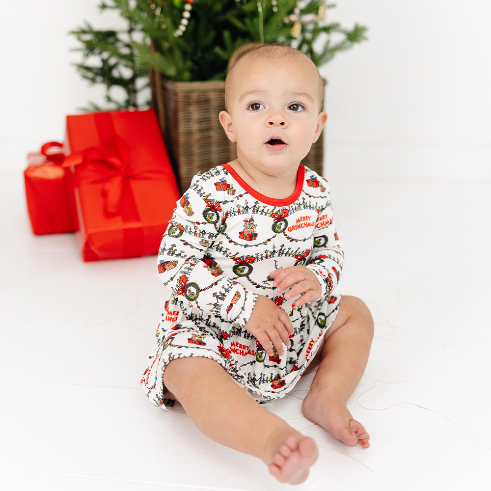 "Twirling with Who-ville cheer!" This A-line bamboo dress features a hidden bodysuit and a bamboo satin back bow. The bamboo fabric allows for comfortable movement during first steps.