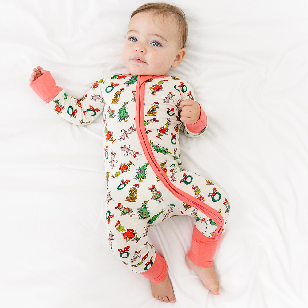 The "Christmas Green Face Pals and Tree" Designed for little Whos, this bamboo romper features a convenient two-way zipper for easy diaper changes and a gentle envelope neckline for chin protection. The bamboo fabric allows for unrestricted movement during tummy time.