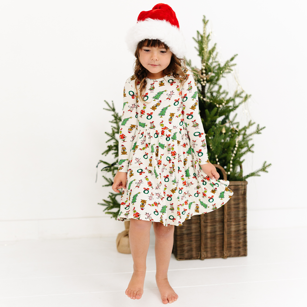 Christmas Green Face Pals and Tree Kids Bamboo Long Sleeves Dress