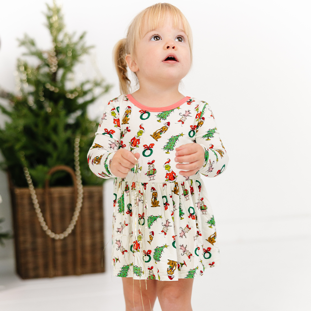 "Twirling with Who-ville cheer!" This A-line bamboo dress features a hidden bodysuit and a bamboo satin back bow. The bamboo fabric allows for comfortable movement during first steps.